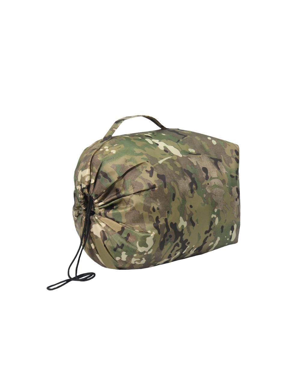 Модель спального мешка с подголовником имеет размер: 0,75 х 1,8 м плюс подголовник 0,5 м. В качестве утеплителя используется объемный синтепон 2 слоя 150 г/кв.м., внутренняя отделочная ткань бязь тёмного цвета. Температурный режим до - 5 С.