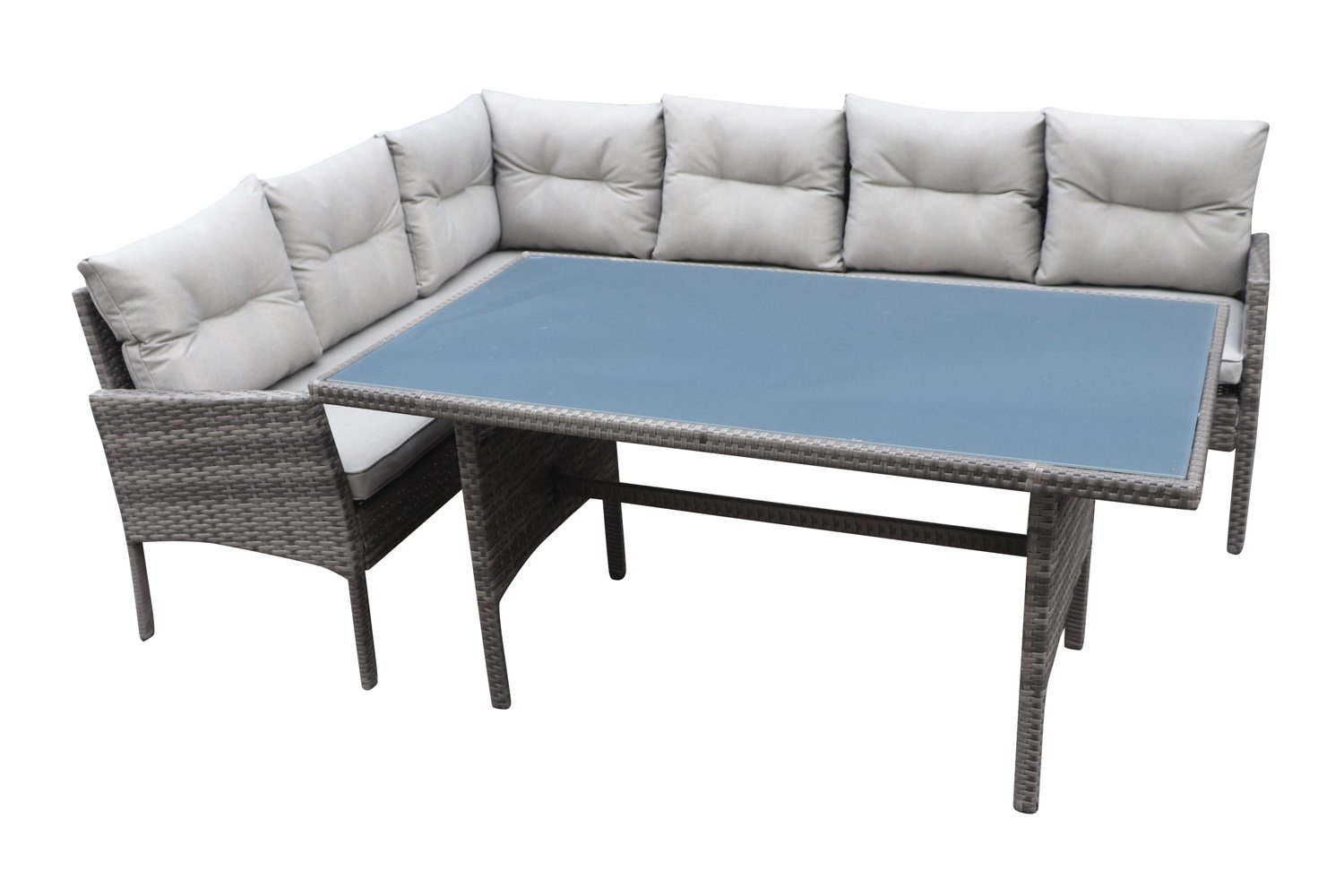 Набор садовой мебели представляет собой угловой диван с обеденным столиком, состоящий из стального каркаса, покрытого и соединенного искусственным ротангом – материалом синтетического происхождения, который предназначен для эксплуатации на улице.