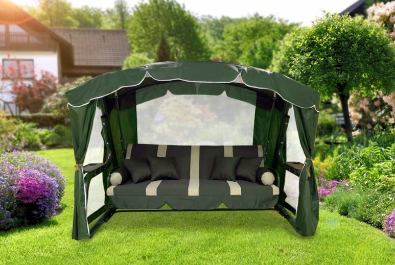 У нас вы можете купить комплект для садовых качелей Сингапур. Весь комплект выполнен в зелёном цвете, в него входит тент, а также москитная сетка. Все тканевые элементы данного комплекта изготовлены из материала оксфорд 210, который не пропускает воду, не портится от солнечных лучей, не выгорает. Если вы хотите спокойно отдыхать на своих садовых качелях, при этом не беспокоясь за то, что погода нарушит ваш отдых, такой комплект именно для вас.